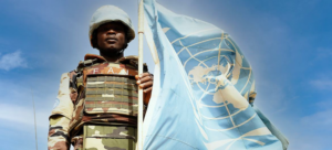 MINUSMA/Harandane Dicko – Un Casque bleu nigérien pose devant le drapeau des Nations Unies...