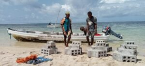 Des villageois de Kuruwitu chargent sur un bateau des blocs de ciment destinés à...